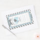Grey and white chevron print with blue accents and 3D-look polka-dot bow with blue elephant with bow-tie and bird book plate label design.