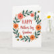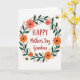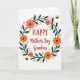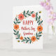 This card features a white background with a winding wreath of deep green leaves and thin branches wrapped into an oval, like a gentle hug around the message ❤️. Inside the wreath, stylized flowers in coral and bright orange bloom with simple shapes that feel friendly and affectionate. Small clusters of red berries and tiny golden star-like accents are scattered around the leaves, adding a soft sparkle without crowding the design. Two small winged insects with sunny yellow bodies and black stripes hover near the outer edge, as if circling together in a sweet little dance. The main text sits centered within the wreath, with the first word larger in strong red letters and the remaining lines in a flowing red cursive style. The red lettering stands out sharply against the white space, while the green foliage frames it like a calm, caring border 🌼. Coral petals and orange blossoms appear at several points around the wreath, with red berries tucked between leaves and a few golden star accents near the top right and lower left.