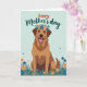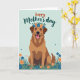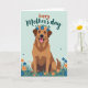 This card shows a friendly dog sitting against a pale blue‑green background, drawn with smooth outlines and fur shaded in warm brown and russet. Its upright posture and steady gaze feel like a loyal friend leaning in for attention, and the open smile shows small white teeth and a pink tongue for an affectionate, welcoming look ❤️. A flower crown rests on its head, made of small blue and orange blooms with fresh green leaves, adding a gentle, affectionate touch. Along the bottom, layered grass in emerald and teal spreads out like a soft garden bed, dotted with orange and deep indigo flowers that mirror the crown. Near the top, a short Mother’s Day message is placed in a flowing, dark ink style that stands out clearly against the light background. The colors stay soft overall, with the warm fur tones drawing your eye back to the dog’s face and the tender mood it suggests 🌼. The final detail is the ring of blue and orange flowers circling the dog’s head with green leaves tucked between each bloom.