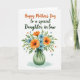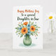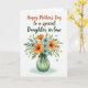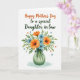Designed with a bright illustrated bouquet that fills the lower half of a crisp white background, this card centers on family closeness with a gentle, affectionate tone ❤️. Orange flowers with lightly textured petals mingle with small sky-blue blooms, each with darker centers that add depth and a natural look. The arrangement sits in a semi-transparent vase tinted soft jade, shaded to suggest a calm glow, and a thin dark ribbon is tied neatly around the neck. Above the flowers, the main greeting is placed prominently near the top in orange decorative lettering, drawing the eye first. Just beneath it, the recipient line appears in a flowing forest-green style, giving the message a tender, caring feel without crowding the layout 👩. Small red hearts and tiny blue star-like bursts are scattered around the bouquet, like little visual nods to affection and celebration. The overall composition keeps generous white space so the colors feel airy and the details stand out. A few crimson hearts float near the upper corners while blue starbursts dot the space around the text.