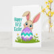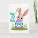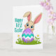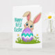 This card shows a cute, human-like bunny with long ears in warm beige, peeking from behind a large decorated egg with a tender, friendly gaze 🐰. The bunny’s inner ears are soft pink, and its big blue eyes, rosy cheeks, and small smile give it a sweet, affectionate look, like it’s sharing a quiet moment with the viewer. The egg takes center stage with zigzag chevron stripes in lavender, white, and bright aqua wrapping all the way around. Along the bottom, a strip of green grass grounds the scene, sprinkled with small white daisies with sunny yellow centers 🌷. On the left side, the words “Happy First Easter” appear in a flowing aqua style, set against the open white background. The spacious white backdrop keeps the focus on the bunny, the egg, and the message, making the colors stand out without feeling busy. The bunny’s paws and one ear edge are tucked behind the egg, and the egg sits just above the grass line with daisies scattered nearby.