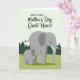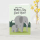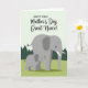 This design shows two stylized grey elephants filling the lower two-thirds of the card, with a larger adult standing slightly to the right and a smaller youngster stepping forward on the left. The adult’s gentle sideways glance toward the little one, with a single dot eye and smooth white tusks, adds a tender, protective closeness ❤️. They stand on a lightly textured lime-green field, while a row of dark evergreen triangle trees forms a simple forest line behind them. Above the landscape sits a pale sage-green sky that keeps the scene soft and calm. Centered in the upper half, the main message is set in two type styles: a crisp sans-serif line paired with a more flowing line beneath it, both in a darker green for easy reading. The spacing leaves plenty of breathing room around the words, so your eyes move naturally from the text down to the pair below 🌼. The background stays minimal, with the triangle treetops stretching in a neat row just below the centered lettering.