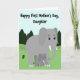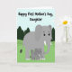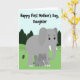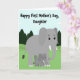 This card shows a sweet cartoon-style scene of a large gray elephant standing close beside a smaller elephant, their bodies angled together as if sharing a quiet, caring moment ❤️. The bigger elephant’s wide stance and lowered head suggest gentle protection, while the little one leans in with a trusting, affectionate posture. Both have oversized ears, long trunks, and small white tusks, with round dark eyes that look soft and kind. Across the top, the message “Happy First Mother’s Day, Daughter,” appears in thick black lettering, centered above the pair. Behind them, rolling green hills stretch into the distance with simple evergreen trees scattered along the slopes. A light blue sky sits overhead with puffy white clouds, keeping the scene calm and airy 🌼. The colors are flat and smooth with clear outlines, giving the illustration a friendly, easy-to-read look. The elephants stand on a grassy green foreground with a few darker green shrubs near their feet.