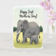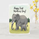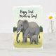 This card shows a gentle scene of a large gray elephant with long white tusks standing close beside a smaller calf with tiny tusks, their bodies angled toward each other as if sharing a quiet, affectionate moment ❤️. The adult’s relaxed posture and the calf’s snug position near its front legs suggest trust and closeness without needing any extra details. They stand in a yellow‑green grassy field with soft light dappling the ground and small texture changes that hint at blades bending in a breeze. In the distance, a dark green line of tall, needle‑leaf trees stretches across the horizon, adding depth behind the pair. Above them, the sky fades from a light mint tone into a creamy pale shade, with a gentle wash effect that keeps the background calm and airy. Across the top, the words “Happy First Mother’s Day!” are written in black, flowing lettering and centered so they sit clearly above the elephants 🌼. The illustration uses smooth outlines and light shading to keep the focus on the animals’ tender closeness. A soft gradient in the sky shifts from mint green near the treetops to cream higher up.