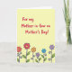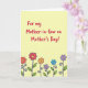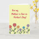 Designed with a sunny, pale yellow background, this card keeps the scene light and welcoming 🌼. Across the upper two-thirds, large hand-lettered text in deep crimson sits centered, reading as a Mother’s Day message with an affectionate, family-first tone ❤️. The lettering feels friendly and confident, with plenty of open space around it so the words stand out. Beneath the text, a neat horizontal row of stylized flowers stretches across the page like a small garden border. The blossoms are flat-colored in red, orange, lavender, and sky blue, and each one has a contrasting yellow center that draws the eye. Thick black outlines give the flowers a crisp, illustrated look, while slim green stems and tiny curling tendrils add a gentle, caring touch. The bottom band of flowers sits just above the lower edge, with the stems rising upward and the petals framed in black.
