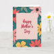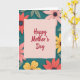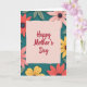 This card features a pale blush-pink rectangular panel in the center, slightly irregular at the edges, creating a soft, welcoming focal area. Across the middle of that panel, the words “Happy Mother’s Day” appear in flowing cursive lettering, colored a warm deep red that feels affectionate ❤️. Around the panel is a deep teal background filled with a lush border of stylized flowers and leaves, arranged like a gentle embrace. The blooms mix coral, soft rose, and sunny yellow tones, with muted sage-green foliage weaving between them, giving the scene a friendly, caring closeness 🌼. Petals vary in shape and size, and the flower centers add contrast with dark blue-black or earthy brown dots and textures. Some leaves and blossoms tuck behind the central panel while others stretch along the edges, creating a layered frame. The deep teal backdrop makes the warm florals stand out, and the red lettering sits centered on the blush panel with generous open space around it.