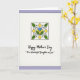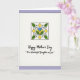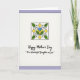This card features a calm, thoughtfully arranged layout with a soft pale lavender border around a white center panel. A thin black outline frames the white area, giving the design a neat, gallery-like feel. Near the top sits a square-framed floral emblem that feels like a tender little tribute, as if meant to be admired up close ❤️. In the middle of the emblem is a bright blue petal shape nestled into rich green leaves, with curling black tendrils that add a gentle, affectionate flourish. Four yellow diamond accents sit around the bloom in a balanced pattern, like small sunny notes 🌼. Below the artwork, the main message “Happy Mother’s Day” is placed in an elegant, flowing style in black, with “To a Wonderful Daughter in Law” set underneath in the same black lettering. The upper motif is outlined in black like a stained-glass window, with the blue center and yellow diamonds standing out against the white background. The lavender margin stays soft and even on all sides, while the floral square remains centered above the lines of text.