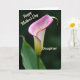This Mother's Day card features a tall, vertical layout with one elegant bloom, shaped like a smooth, sculpted lily, set against a softly blurred, dark green background. The flower sits slightly off-center, and its curling petal edge glows in magenta-pink before fading into bright white and then into a gentle yellow‑green near the base. A textured golden‑orange center rises from within, adding warmth like a small candlelit accent ❤️. Soft, diffused lighting reveals fine vertical lines on the petal, giving it a delicate, porcelain-like look and a quiet, caring mood. In the upper left, the words “Happy Mother’s Day” appear in a flowing, cursive-style lettering, colored in a light tone that stands out against the darker backdrop. Lower and to the right, “Daughter” is set in a simple, easy-to-read font, creating a tender sense of closeness between the message and the bloom 🌼. The background remains deep and out of focus, with the flower’s edges lightly haloed as if glowing in front of shaded leaves.