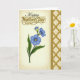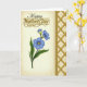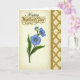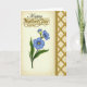 This card features three blue flowers with fine vein details and sunny yellow centers, surrounded by slim green leaves and a small budding stem that leans in like a gentle hug ❤️. The blossoms sit slightly left of center, giving the arrangement a cozy, close-together feel that suits a caring relationship. Near the top, the word “Happy” appears in flowing black lettering, and just below it “Mother’s Day!” is set in shiny gold letters with a raised, metallic look 🌼. The left background is a soft cream tone with a faint, elegant pattern that quietly frames the flowers without stealing attention. Along the right edge, a tall decorative panel adds structure, starting with a thin gold border and expanding into an intricate gold trellis design. That trellis overlays the same subtle patterned backdrop, creating a layered effect like lace laid over fabric. The gold panel runs vertically from top to bottom, with the lattice shapes repeating in neat rows against the pale cream background.