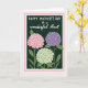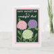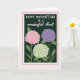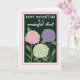 This greeting card features three rounded flower clusters that resemble full hydrangea blooms, set close together like a small bouquet shared between loved ones ❤️. The petals are colored in soft pastel pink, gentle lavender, and mint green, with tiny warm yellow-orange centers that feel like little sparks of affection. Behind them, a deep forest-green background and leafy shapes create a cozy, sheltered setting, as if the flowers are tucked into a quiet garden corner. Across the top, the main line of text reads “HAPPY MOTHER’S DAY” in white, with sturdy, simple lettering that stands out clearly. Just below it, “to a wonderful Aunt” appears in white with flowing, cursive-style lettering, adding a tender, friendly touch 🌼. A thin white inner border and a soft blush-pink outer border frame the artwork, keeping the scene neat and balanced. Subtle shading along the leaves and stems gives the bouquet a gentle depth against the dark green field. The three blooms sit centered beneath the text, their rounded shapes overlapping slightly within the double border.