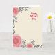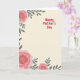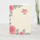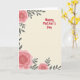 Designed with a soft creamy beige background, this card sets a gentle, cozy scene that feels like a quiet hug ❤️. Coral-pink flowers frame the corners, with a large blossom in the top-left, another anchoring the bottom-left, and a smaller bloom peeking in from the bottom-right. Each flower has a dotted white center made of tiny specks, adding texture against the smooth, layered petals. Slender charcoal-grey leaves and branches weave between the blooms, creating a calm contrast that keeps the arrangement feeling balanced and close. On the center-right, the words “Happy Mother’s Day” appear in a hand-drawn style, written in bright crimson so the message stands out without overpowering the art. The open space around the lettering gives the design room to breathe, like there’s a quiet pause meant for a tender glance or a shared smile 🌼. The coral petals curve outward in soft layers while the dark foliage threads diagonally along the edges.