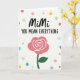 This card features a tender, affectionate layout that pairs friendly lettering with a simple flower illustration ❤️. Near the top, a proper name appears in a loose, flowing handwritten style, followed immediately by a short declaration set in thick uppercase letters. The message sits centered in the upper half, with the name in a darker tone and the uppercase line in a matching, easy-to-read color. Below, a single stylized bloom suggests closeness and care, with rounded pink petals outlined by a thin white spiral that feels like a gentle embrace. The flower rests on a deep green stem with one softly curved leaf, keeping the scene calm and intimate. The background is warm off-white, sprinkled with soft-edged dots that drift around like confetti from a quiet celebration 🌼. Those dots appear in coral, mint, pale yellow, and sky blue, scattered lightly across the space around the text and above the flower.
