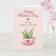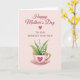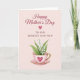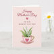 This card opens with a short Mother’s Day message centered near the top in flowing crimson lettering, setting a gentle, affectionate tone ❤️. Just below it, a small pink heart sits like a divider before a second line of dedication in a simple serif style, also near the top and easy to spot. The main artwork features a blush-pink teacup holding a leafy green arrangement, suggesting a quiet moment shared over tea and warm conversation. On the front of the cup, a deeper pink heart emblem hints at closeness, while tiny gold touches along the rim add a soft glow. Nestled among the broad leaves are white, bell-shaped blooms that lean slightly toward one another, like a tender exchange between friends or family 🌼. Everything rests on a matching saucer, and the background stays a muted rosy wash that keeps the scene calm and cozy. The teacup and saucer sit centered in the lower half, with the heart emblem facing forward and the white blooms rising above the rim.