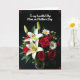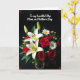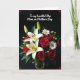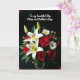 This card features a lush bouquet spilling across the lower half, set against a deep black background that makes every petal stand out. Large white lilies open wide to reveal small golden centers, like a soft glow tucked inside. Deep red roses nestle among them, their layered petals curling inward in a way that feels intimate, like a quiet promise ❤️. White daisies with sunny yellow centers add a light, friendly touch, balancing the richer tones with an easy warmth 🌼. Green leaves and a few unopened buds weave through the flowers, giving the arrangement depth and a sense of closeness, as if gathered for someone special. Near the top, a flowing message in white lettering sits above the bouquet, centered and easy to read against the dark space. Subtle red decorative curls sit in each corner, framing the scene with small, graceful accents.