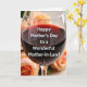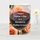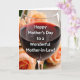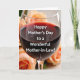 Designed with a clear drinking glass at the center, filled with a deep ruby-red liquid that catches the light like a polished gem. Across the front of the glass, crisp white text reads, “Happy Mother’s Day to a Wonderful Mother-in-Law!” and it sits prominently over the darkest part of the drink for strong contrast. The glass edges gleam with soft highlights, giving the scene a gentle, affectionate glow ❤️. Behind it, the background falls into a smooth blur where apricot and cream blossoms open in loose clusters, adding a tender, caring tone like a quiet hug between close family members. The warm lighting and shallow focus make the message feel intimate, as if spoken softly across a table. The lettering appears centered and evenly spaced, with the white color standing out against the rich red drink. In the distance, pale petals and hints of green stems fade into a creamy backdrop with a few 🌼 tones.