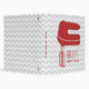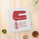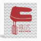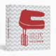 A recipe binder featuring a red silhouette of a hand mixer on front. Personalize with your name. Background is gray on gray chevron. Personalize the text on spine.