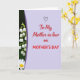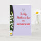 This greeting card is split into two main sections, with a soft lavender panel covering most of the right side and setting a calm, affectionate tone ❤️. Centered on that lavender area, the message “To My Mother-in-law” appears in rich red lettering, with a small black heart drawn just above it like a quiet sign of closeness. Just below, the words “on MOTHER’S DAY” are placed in uppercase red, standing out clearly against the pale background. Along the left third, a deep green strip holds a vertical line of small white, bell-shaped flowers that hang downward, giving the design a gentle, caring feel 🌼. A curved deep violet border separates the floral strip from the lavender space, adding a graceful divide between nature and message. The contrast between the dark green and the bright white blossoms makes the flowers look softly luminous, like a tender gesture offered without fuss. In the bottom-left corner, a partially visible white flower with a bright yellow center peeks in from the edge.