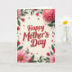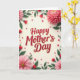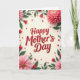 Designed with a creamy ivory background, the card centers on the words “Happy Mother’s Day” in deep crimson lettering edged with a thin golden outline for a romantic, celebratory glow ❤️. The message sits prominently in the middle, with the letters flowing smoothly and drawing your eye in first. A floral border wraps around the text, showing layered petals in soft blush, rosy pink, bright fuchsia, and rich red, like a bouquet gathered with care. Green leaves and small berry-like dots tuck between the blooms, adding a gentle, friendly charm 🌼. The lighting is soft and diffused, making the petals look slightly sculpted and giving the scene a cozy, affectionate mood without needing any extra figures. The center words stay sharply defined while the surrounding flowers fade into a mild blur, creating depth as if the border is closer than the message. The crimson text remains centered while the pink-and-red flowers cluster along the edges, with leafy greens filling the corners.