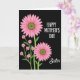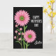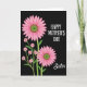 This card features a floral illustration set against a deep black background, creating a striking night-sky setting for the blooms. Two large pink flowers with layered petals and textured green-brown centers sit on a diagonal, one reaching in from the upper left and the other resting toward the lower right like close companions. Between them, a small spray of tiny pink blossoms climbs upward on slender green stems, adding a gentle, friendly closeness to the arrangement ❤️. The dark backdrop makes the rosy petals and fresh greenery look brighter, as if the flowers are leaning toward each other in quiet affection. On the right side, white uppercase lettering reads “HAPPY MOTHER’S DAY,” stacked in a tidy arrangement that balances the flowers. Just below, the word “Sister” appears in smaller white lettering, placed near the lower right to finish the message without crowding the artwork 🌼. The petals show soft shading from hot pink to lighter blush, and the centers are dotted with fine speckles that give them a textured, natural look.