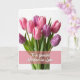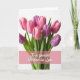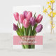 Designed with a lush bouquet of blush pink and deep purple flowers filling the upper two-thirds, this card sits on a bright white background that keeps the focus on the blooms. The petals curl and fold like they’re leaning toward one another, giving the arrangement a tender, close-knit feel ❤️. Fresh green stems gather below, grounding the flowers and adding a steady, comforting contrast. Soft, diffused light makes the blossoms look velvety and lightly dewy, like a quiet moment shared in spring. Across the lower portion, a translucent rose-colored band stretches horizontally, adding a gentle wash of color without hiding the stems. Centered on that band is an affectionate message in white lettering, easy to read and placed low so the bouquet stays front and center 🌼. The purple buds cluster near the top right, while several pale pink blooms fan outward toward the upper left.