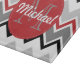 This chevron design in tones of red, grey and black has a red circle with white stitch pattern. Customize with your name and initial. A contemporary design that will brighten up any person's day.