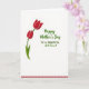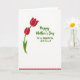 This card features a white background with two stylized deep-red flowers in the upper left, lightly edged with thin white outlines that make the petals stand out. A curved green stem lifts the larger bloom while a smaller bloom sits just below it, close enough to suggest a sweet, companionable closeness ❤️. Near the base of the stem, one pointed green leaf angles outward, adding a slightly off-center, natural touch. On the right side, a message appears in emerald green, with the first words in a flowing cursive-style lettering that feels like a gentle note to someone you care about. Below that, the remaining lines switch to a simpler, straightforward letter style, making the greeting easy to read while still feeling warm. The text area is centered as a neat column, balancing the flowers and leaving plenty of open space around it 🌼. Along the bottom edge, a thin border of small red dashed marks runs horizontally from left to right.