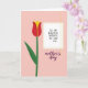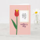 This card features a large stylized tulip on the left, with rich red petals opening toward a sunny yellow center, like a gentle gesture of affection ❤️. A slim green stem and one curved leaf sit against a soft blush-pink background, keeping the scene simple and calm. Along the far left edge, a narrow column of tiny white dots adds a light decorative trim. On the right side, a rectangular text area is outlined with a dashed yellow border, giving the message space to stand neatly on its own. Inside that box, the main wording appears in a straightforward sans-serif style in a dark, easy-to-read color. A thin golden line drops down from the top and lightly crosses near the text area, like a delicate ribbon tying the layout together. Beneath the box, a second line of lettering in deep plum uses flowing cursive-style writing, adding a softer, more romantic touch 🌼. The overall layout balances the tulip’s warm reds and yellows with the pink background, the dashed yellow frame, and the fine gold line on the right.