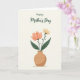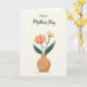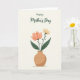 Designed with a calm, romantic touch, this card features a rounded terracotta vase centered on a warm, creamy off-white background, with a soft shadow beneath it. Two flowers rise from the vase like a quiet pair leaning toward each other, suggesting closeness and care ❤️. The larger bloom opens in salmon-pink and peachy-orange tones, its petals spreading outward in a gentle, welcoming shape. Next to it, a slimmer stem holds a smaller, muted yellow flower that feels like a sweet reply in the arrangement 🌼. Deep green leaves with defined outlines frame both blossoms and add weight near the base. Near the top, a flowing cursive-style message sits above the flowers in dark green, spaced clearly so it stands out without crowding the art. The vase has an earthy, rounded silhouette, and the two stems curve upward with the peach flower on one side and the pale yellow flower on the other.