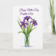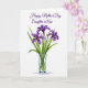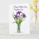 This card shows a watercolor-style bouquet of three large flowers in deep violet, arranged to feel like a gentle gift of friendship and family ❤️. Each bloom has fanned petals and a golden-yellow center that draws the eye without overpowering the calm white background. Slender green leaves in varied shades rise upward, giving the arrangement a graceful, reaching shape, like an affectionate gesture. A clear glass vase with a faint blue tint sits below, and the stems are visible through the water for a quiet touch of realism. Near the top of the card, the message “Happy Mother’s Day Daughter-in Law” is placed above the flowers in flowing purple lettering that echoes the petals. The soft blending of color and light edges keeps everything tender and airy, with a calm, loving mood rather than anything loud. A small 🌼 detail comes through in the warm yellow centers, adding a cozy contrast to the cool purples and greens. A faint shadow rests under the vase, lightly grounding it on the white surface.
