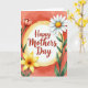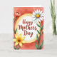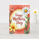 Designed with a luminous white circle edged in gold at the center, this card draws your eye straight to the greeting. Inside the circle, “Happy Mothers Day” sits neatly in deep coral-red lettering, centered and easy to read. Around it, soft watercolor flowers lean inward like close friends gathered for a hug ❤️. A white daisy-like bloom with a warm yellow-orange center sits alongside a red, water-lily-shaped blossom with gently shaded petals, plus a sunny yellow flower with many rounded petals 🌼. Slender green stems and leafy sprigs curl around the circle, adding a tender, garden-fresh closeness to the layout. Behind everything, a coral-pink wash fades into lighter peach tones, like a calm sky at sunrise. Fine brush textures and smooth color gradients drift across the background, with the gold rim catching light against the warm pink haze.