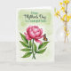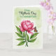 This card features a large, fully opened pink flower centered on the front, with layered petals that curl and overlap like a soft embrace ❤️. A sturdy green stem rises from the bottom, framed by two deep-green leaves with fine veins that feel like quiet, steady support. Resting on one leaf is a small winged insect with orange and black markings, tiny white dots, and a bright blue accent, as if it has paused to admire the bloom. The pale green background has a gentle painted wash that makes the flower and insect stand out without feeling harsh. Near the top, a short message is placed above the flower in flowing green lettering, leaving plenty of open space around it. The composition feels like a tender meeting between nature’s details, where the insect’s calm pose and the bloom’s open face suggest closeness and care 🌼. The petals range from light blush to deeper pink toward the center, while the insect’s patterned wings angle slightly upward against the soft green backdrop.
