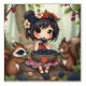A sweet fairy tale wall art for a child's room. A cute little cartoon chibi fairy eating blackberries with her forest friends, a raccoon and squirrel.