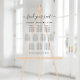 Chic clear acrylic wedding seating sign for up to 10 tables featuring "find your seat" in a stylish script with swashes, your first names and wedding date joined by a heart and "We're so glad you're here" in classic serif typography.