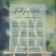 Chic sage green frosted acrylic wedding seating chart sign for up to 12 tables featuring "find your seat" in an elegant script with swashes, "We're so glad you're here" in simple modern typography and your names and wedding date joined together by a heart.