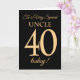 A chic 40th Birthday Card for a 'Very Special Uncle', with a number 40 composed of gold-effect numbers and the word 'Uncle', in gold-effect, on a black background. The inside message, which you can change if you wish, is 'Happy Birthday'