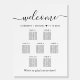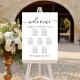 Chic wedding foam board seating chart for 7 tables featuring "welcome" in an elegant swash script, your names and wedding date joined together by a gold heart and "We're so glad you're here" in classic serif typography.