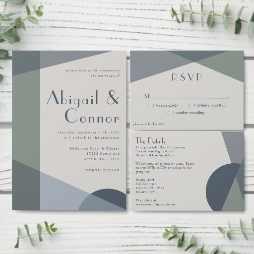 Elements: abstract geometric shapes, color blocks, chic sans serif font for names, understated serif fonts for details. Colors: sage, mint, pistachio, evergreen, dusty blue, botanical, navy, evening, midnight,cetacean, parchment, light grey, platinum. Themes: modern, minimalist, abstract, clean, cheerful, cool tones, understated, boho, scandi, contemporary, industrial. Collection: Chic Abstract Geometric Sage Navy Dusty Blue Wedding Collection Product Type: RSVP
