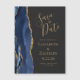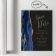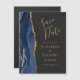 This elegant modern save the date magnet card features a navy blue watercolor agate border trimmed with faux gold glitter. Easily customize the gold colored text on a dark charcoal gray background.
