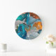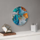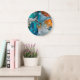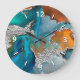 White graphic numerals overlay a rich, glam, silver veined, turquoise blue and yellow orange abstract watercolor on this elegant, trendy, modern, wall clock. Your choice of a round or square clock face. Makes a welcome and stylish statement wherever it’s hung. A great addition to your living room or bedroom, as well as a wonderful gift for a friend!