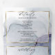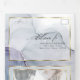 Ethereal splash of alcohol ink stains in shades of ocean blue, teal and rich amethyst purple - each section highlighted with a sheer white gold framed overlay, on the front center is your photo accented with a double gold frame and behind the sheer white overlay for an esoteric appeal a beautiful modern abstract design for an all in one wedding invitation complete with pre-addressed detachable meal choice rsvp for your guests to easily mail back - a stunning all in one wedding invitation -