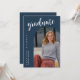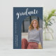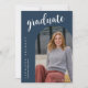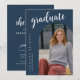 The graduation invitation has a modern and elegant design. The front features a large script title, an arch-shaped frame showcasing the graduate’s portrait, and vertical text displaying their name and school in a clean serif font and Navy Blue Background. The back maintains a minimalist style with a bold script heading, structured event details, and a small graduation cap graphic. The design is clean, sophisticated, and easy to read.