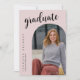 The graduation invitation has a modern and elegant design. The front features a large script title, an arch-shaped frame showcasing the graduate’s portrait, and vertical text displaying their name and school in a clean serif font and Light Pink Background. The back maintains a minimalist style with a bold script heading, structured event details, and a small graduation cap graphic. The design is clean, sophisticated, and easy to read.