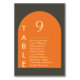 Elevate your event's seating arrangements with this modern and minimalist table number. The design features a bold orange arch against a charcoal grey background, with the large number '9' prominently displayed. Beneath the number, a list of guest names is elegantly presented in a clean font, making it easy for attendees to find their assigned table. This table number adds a sophisticated and contemporary touch to weddings, corporate events, or any special occasion seeking a chic aesthetic. Its unique design ensures it will be a stylish and functional addition to your table settings.