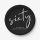 Chic black paper plates for your 60th birthday party that feature "sixty" showcased in a large white script.