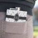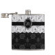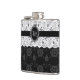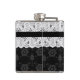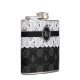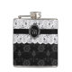 Elegant lady's flask with graphics of white lace over a black on black floral damask background. Graphics of a black ribbon with a silver tone and black cameo decoration, with a white single letter monogram, decorates the middle of the lace. Personalize the monogram, for yourself or as a lovely gift idea.