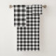 Add a striking accent to your bathroom with a stylish custom towel set including a wash cloth, hand towel, and bath towel featuring a chic black and white plaid pattern. Black, white, and grey squares form a bold checked plaid with thin lines of white dividing the black and gray squares. Buy the full set or any piece of it.