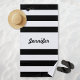 Lounge at the beach, pool or on the boat in style with this chic and classic black and white striped beach towel featuring your name in modern script text over a thicker white accent stripe. Have fun changing the text and stripe colors to further match your style.