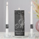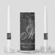 This chic personalized monogram wedding unity candle set for newlyweds features an elegant gray monogram initial in script calligraphy with your names and wedding date below on a faux black brushed metallic background with sparkly dripping glitter. Designed by Susan Coffey.