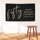 Chic black 50th birthday party banner and welcome sign that features "fifty" showcased in a stylish gold script and your name and the date in modern gold lettering.