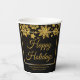 Chic corporate Christmas party paper cup with Happy Holidays written in elegant gold cursive script under a beautiful border of snowflakes falling on modern black holiday decor. Customize these professional holiday cups with your company or business name.